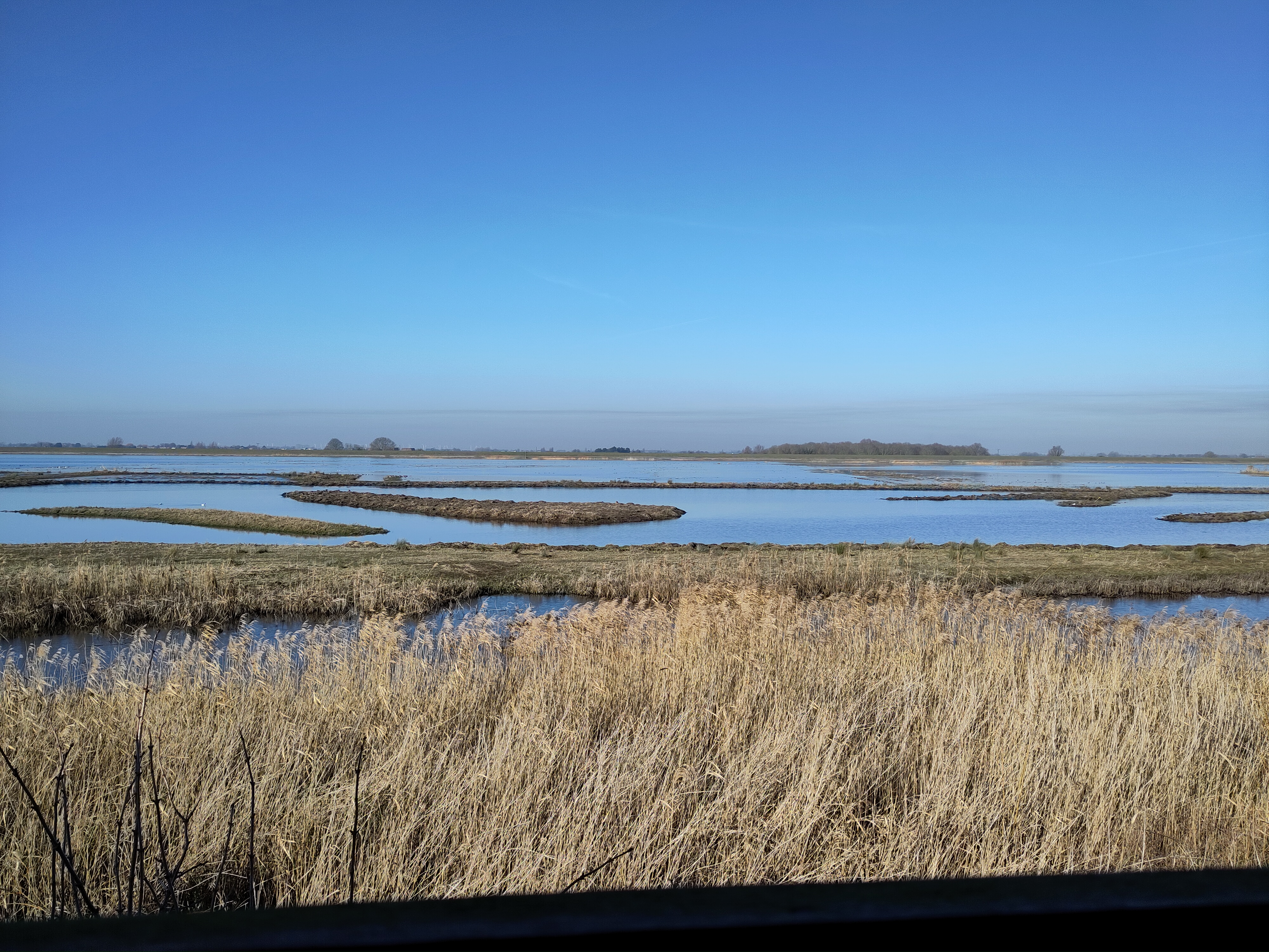 It’s a clear morning in early February, there’s a tang of cold and salt in the air. A shimmering flock of black-tailed godwits lifts off from the flooded meadows. The view from the hide is blue as far as the horizon with its wind turbines, broken only by golden reed beds and islands of higher ground.
